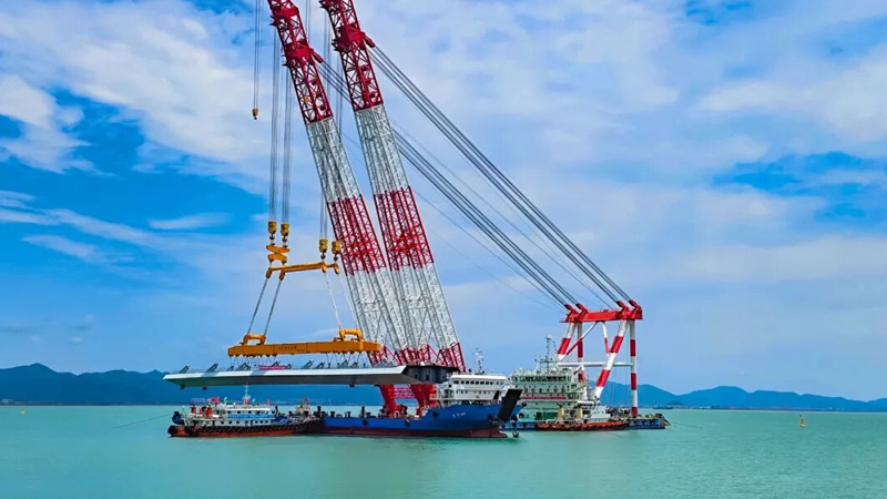 寧波至象山市域(郊)鐵路象山港跨海大橋主橋邊跨結(jié)合梁架設(shè),巨力索具鋼箱梁吊具全程保障項目吊裝。
