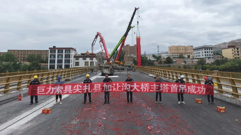 6月20日,加讓溝大橋主塔首吊作業(yè)取得圓滿成功,巨力索具股份有限公司承建了該項目的所有上部懸索結(jié)構(gòu),包括基座及主塔鋼結(jié)構(gòu),索鞍和索夾鋼結(jié)構(gòu),懸索橋主纜,吊桿用鋼拉桿及錨固鋼拉桿。