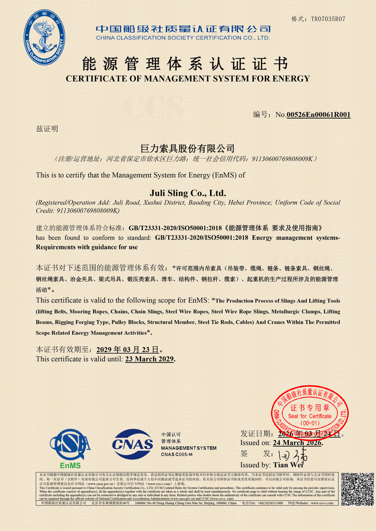 官宣 | 巨力索具斬獲中國船級(jí)社(CCS)能源管理體系認(rèn)證證書!
