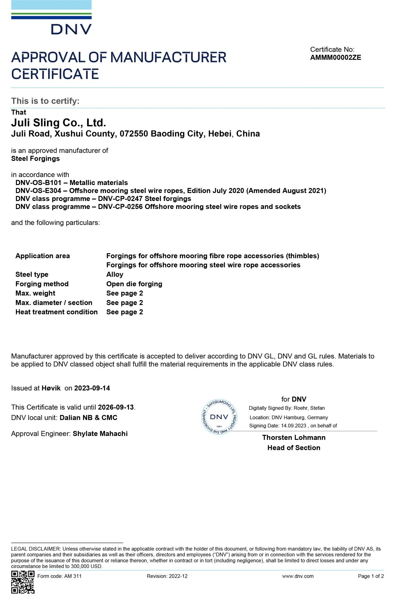 巨力索具先后取得挪威船級(jí)社(DNV)多項(xiàng)認(rèn)證,逐步構(gòu)建起較為完整的系泊產(chǎn)品認(rèn)證體系。△ DNV焊接工廠認(rèn)可證書△ 永久系泊用單股涂塑鋼絲繩的DNV·GL工廠認(rèn)可證書△ DNV長期系泊鋼絲繩接頭及纜繩套環(huán)鍛件工廠認(rèn)可證書