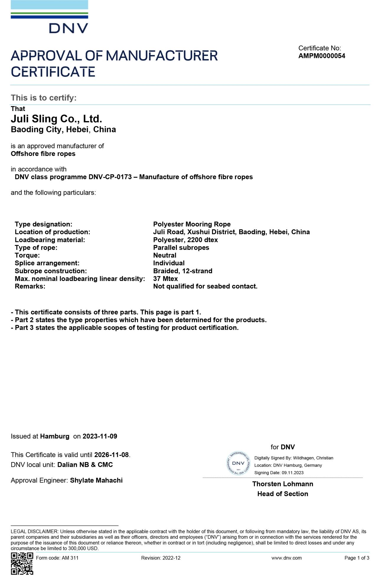 △ DNV長期系泊纜繩(滌綸)工廠認(rèn)可證書法國船級(jí)社(BV)