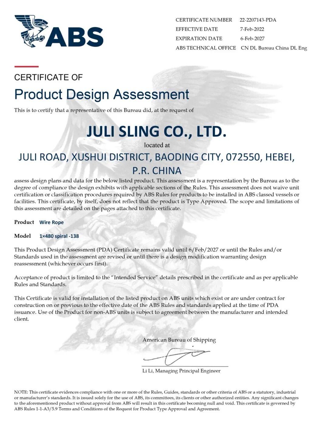 2022年,巨力索具取得美國船級(jí)社(ABS)單股鋼絲繩ABS設(shè)計(jì)評(píng)估證書,這是巨力索具在深海系泊領(lǐng)域取得的重要資質(zhì)認(rèn)證之一。